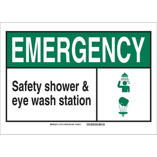 This is manufactured by Brady Corporation. The manufacturer part number is 120666. Label with a size of 10.00" l x 7.00" w (254.0mm x 177.8mm). The product is rohs3 compliant. It is assigned with possible HTSUS value of 3926.90.9985. It is shipped in bulk. It has a classic black and green legend, white background colour. The product brady®, is a highly preferred choice for users. The product is made from highly stable and reliable polyester. In addition, it is reach unaffected. Its typical moisture sensitivity level is not applicable. A bespoke label is a emergency. safety shower. eye wash station label. The product is suitable for use with emergency. It has a long 4 weeks standard lead time. The product is designated with the ear99 code number