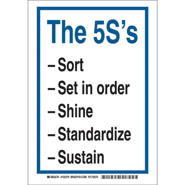 This is manufactured by Brady Corporation. The manufacturer part number is 122279. Label with a size of 10.00" l x 7.00" w (254.0mm x 177.8mm). The product is rohs3 compliant. It is assigned with possible HTSUS value of 3926.90.9985. It is shipped in bulk. It has a classic black and blue legend, white background colour. The product brady®, is a highly preferred choice for users. The product is made from highly stable and reliable polyester. In addition, it is reach unaffected. Its typical moisture sensitivity level is not applicable. A bespoke label is a the5s's. sort. set in order. shine. standardize. sustain label. It has a long 4 weeks standard lead time. The product is designated with the ear99 code number