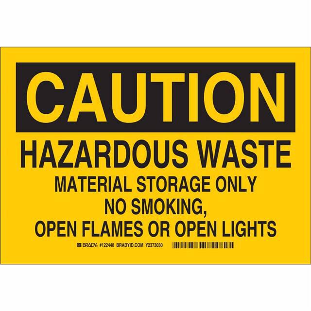 This is manufactured by Brady Corporation. The manufacturer part number is 122448. Label with a size of 10.00" l x 7.00" w (254.0mm x 177.8mm). The product is not applicable. It is assigned with possible HTSUS value of 8310.00.0000. It is shipped in bulk. It has a classic black legend, yellow background colour. The product brady®, is a highly preferred choice for users. The product is made from highly stable and reliable aluminum. In addition, it is reach affected. Its typical moisture sensitivity level is not applicable. A bespoke label is a caution. hazardous waste material storage only no smoking, open flames or open lights label. The product is suitable for use with caution. It has a long 4 weeks standard lead time. The product is designated with the ear99 code number