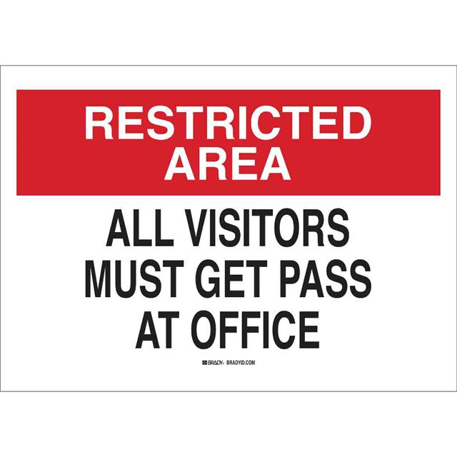 This is manufactured by Brady Corporation. The manufacturer part number is 122531. Label with a size of 10.00" l x 7.00" w (254.0mm x 177.8mm). The product is rohs3 compliant. It is assigned with possible HTSUS value of 3926.90.9985. It is shipped in bulk. It has a classic black and red legend, white background colour. The product brady®, is a highly preferred choice for users. The product is made from highly stable and reliable polyester. In addition, it is reach unaffected. Its typical moisture sensitivity level is not applicable. A bespoke label is a restricted area. all visitors must get pass at office label. It has a long 4 weeks standard lead time. The product is designated with the ear99 code number