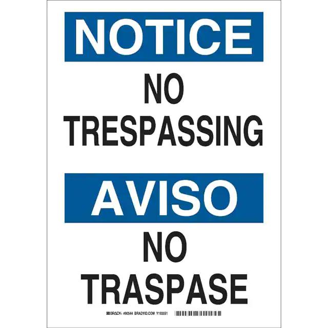 This is manufactured by Brady Corporation. The manufacturer part number is 122810. Label with a size of 10.00" l x 7.00" w (254.0mm x 177.8mm). The product is rohs3 compliant. It is assigned with possible HTSUS value of 3926.90.9985. It is shipped in bulk. It has a classic black and blue legend, white background colour. The product brady®, is a highly preferred choice for users. The product is made from highly stable and reliable fiberglass. In addition, it is reach unaffected. Its typical moisture sensitivity level is not applicable. A bespoke label is a notice. no trespassing/prohibido el paso label. The product is suitable for use with notice. It has a long 4 weeks standard lead time. The product is designated with the ear99 code number