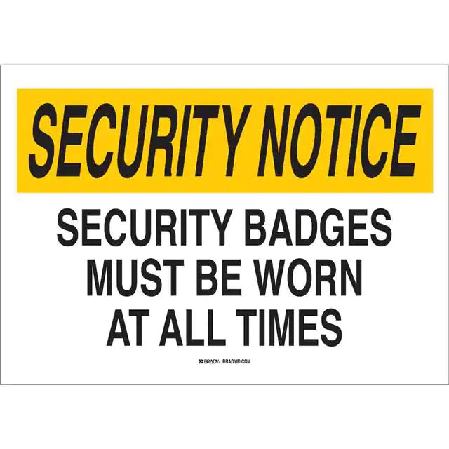 This is manufactured by Brady Corporation. The manufacturer part number is 122886. Label with a size of 10.00" l x 7.00" w (254.0mm x 177.8mm). The product is rohs3 compliant. It is assigned with possible HTSUS value of 3926.90.9985. It is shipped in bulk. It has a classic black and yellow legend, white background colour. The product brady®, is a highly preferred choice for users. The product is made from highly stable and reliable fiberglass. In addition, it is reach unaffected. Its typical moisture sensitivity level is not applicable. A bespoke label is a security notice. security badges must be worn at all times label. The product is suitable for use with notice. It has a long 4 weeks standard lead time. The product is designated with the ear99 code number