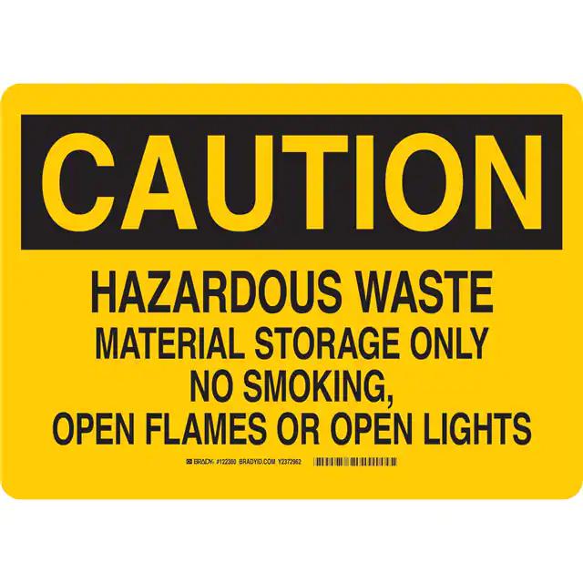 This is manufactured by Brady Corporation. The manufacturer part number is 122899. Label with a size of 10.00" l x 7.00" w (254.0mm x 177.8mm). The product is rohs3 compliant. It is assigned with possible HTSUS value of 3926.90.9985. It is shipped in bulk. It has a classic black legend, yellow background colour. The product brady®, is a highly preferred choice for users. The product is made from highly stable and reliable fiberglass. In addition, it is reach unaffected. Its typical moisture sensitivity level is not applicable. A bespoke label is a caution. hazardous waste material storage only no smoking, open flames or open lights label. The product is suitable for use with caution. It has a long 4 weeks standard lead time. The product is designated with the ear99 code number
