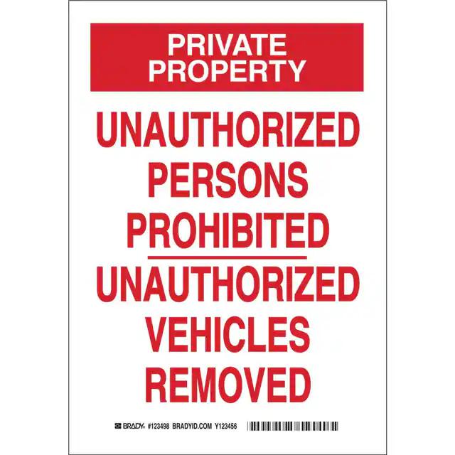 This is manufactured by Brady Corporation. The manufacturer part number is 123496. Label with a size of 10.00" l x 7.00" w (254.0mm x 177.8mm). The product is rohs3 compliant. It is assigned with possible HTSUS value of 8310.00.0000. It is shipped in bulk. It has a classic red legend, white background colour. The product brady®, is a highly preferred choice for users. The product is made from highly stable and reliable aluminum. In addition, it is reach unaffected. Its typical moisture sensitivity level is not applicable. A bespoke label is a privateproperty. unauthorized persons prohibited unauthorized vehicles removed label. The product is suitable for use with warning. It has a long 4 weeks standard lead time. The product is designated with the ear99 code number