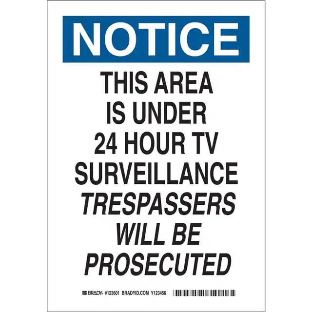 This is manufactured by Brady Corporation. The manufacturer part number is 123604. Label with a size of 14.00" l x 10.00" w (355.6mm x 254.0mm). The product is rohs3 compliant. It is assigned with possible HTSUS value of 3926.90.9985. It is shipped in bulk. It has a classic black and blue legend, white background colour. The product brady®, is a highly preferred choice for users. The product is made from highly stable and reliable polyester. In addition, it is reach unaffected. Its typical moisture sensitivity level is not applicable. A bespoke label is a notice. this area is under 24 hour tv surveillance trespassers will be prosecuted label. The product is suitable for use with warning. It has a long 4 weeks standard lead time. The product is designated with the ear99 code number