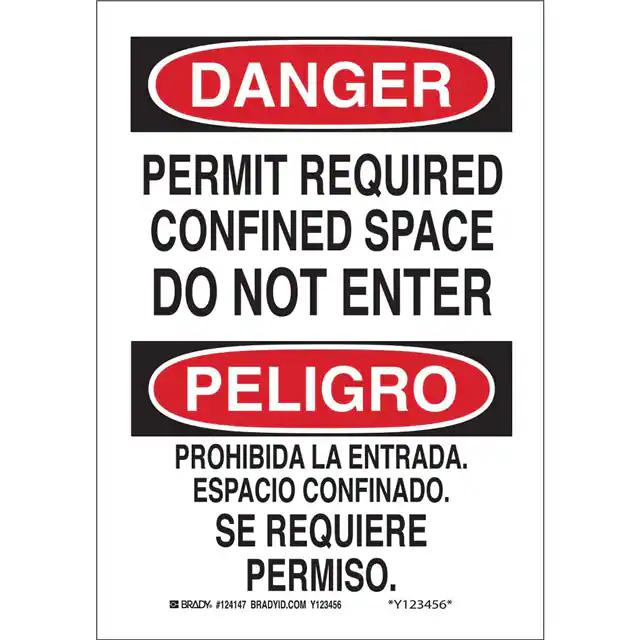 This is manufactured by Brady Corporation. The manufacturer part number is 124149. Label with a size of 14.00" l x 10.00" w (355.6mm x 254.0mm). The product is rohs3 compliant. It is assigned with possible HTSUS value of 3926.90.9985. It is shipped in bulk. It has a classic black and red legend, white background colour. The product brady®, is a highly preferred choice for users. The product is made from highly stable and reliable polyester. In addition, it is reach unaffected. Its typical moisture sensitivity level is not applicable. A bespoke label is a permit required confined space do not enter. prohibida la entrada. espacio confinado. se label. The product is suitable for use with warning. It has a long 4 weeks standard lead time. The product is designated with the ear99 code number