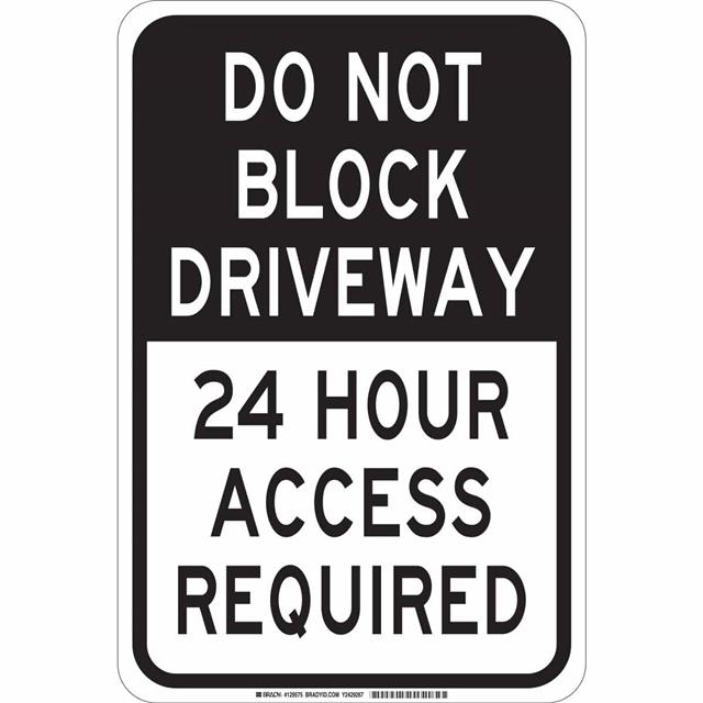 This is manufactured by Brady Corporation. The manufacturer part number is 124355. Label with a size of 18.00" l x 12.00" w (457.2mm x 304.8mm). The product is not applicable. It is assigned with possible HTSUS value of 3926.90.9985. It is shipped in bulk. It has a classic black legend, white background colour. The product brady®, is a highly preferred choice for users. The product is made from highly stable and reliable polyester. In addition, it is reach unaffected. Its typical moisture sensitivity level is not applicable. A bespoke label is a do not block drive way. 24 hour access required label. It has a long 4 weeks standard lead time. The product is designated with the ear99 code number