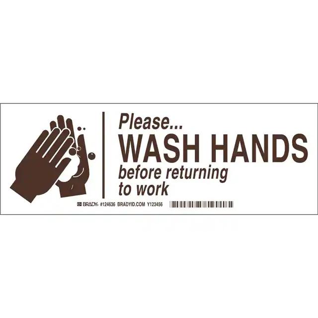 This is manufactured by Brady Corporation. The manufacturer part number is 124636. Label with a size of 10.00" l x 3.50" w (254.0mm x 88.9mm). The product is rohs3 compliant. It is assigned with possible HTSUS value of 3926.90.9985. It is shipped in bulk. It has a classic brown legend, white background colour. The product brady®, is a highly preferred choice for users. The product is made from highly stable and reliable polyester. In addition, it is reach unaffected. Its typical moisture sensitivity level is not applicable. A bespoke label is a please...wash hands before returning to work label. The product is suitable for use with warning. It has a long 4 weeks standard lead time. The product is designated with the ear99 code number