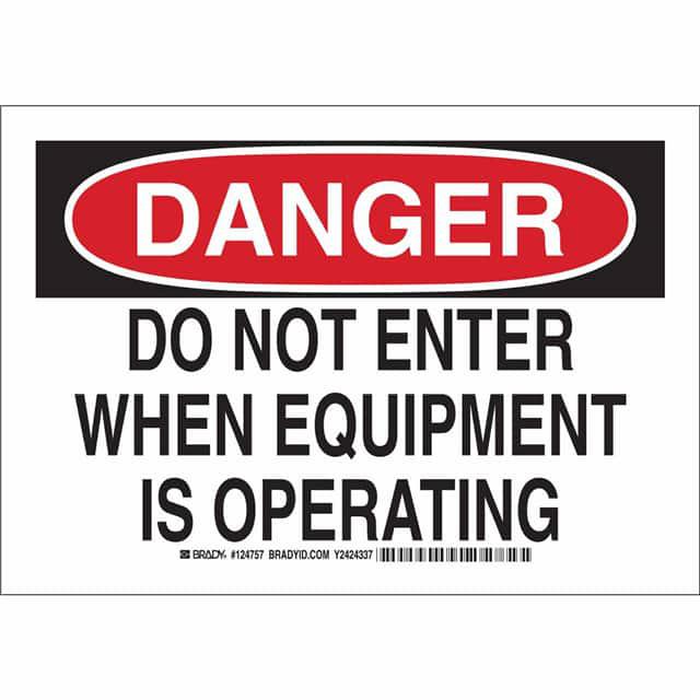 This is manufactured by Brady Corporation. The manufacturer part number is 124755. Label with a size of 10.00" l x 7.00" w (254.0mm x 177.8mm). The product is rohs3 compliant. It is assigned with possible HTSUS value of 8310.00.0000. It is shipped in bulk. It has a classic black and red legend, white background colour. The product brady®, is a highly preferred choice for users. The product is made from highly stable and reliable aluminum. In addition, it is reach unaffected. Its typical moisture sensitivity level is not applicable. A bespoke label is a danger. do not enter when equipment is operating label. The product is suitable for use with warning. It has a long 4 weeks standard lead time. The product is designated with the ear99 code number