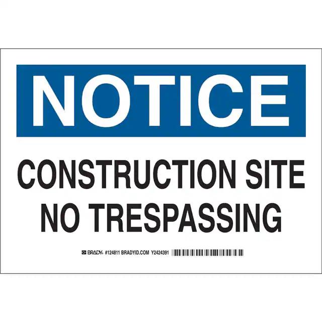 This is manufactured by Brady Corporation. The manufacturer part number is 124810. Label with a size of 10.00" l x 7.00" w (254.0mm x 177.8mm). The product is rohs3 compliant. It is assigned with possible HTSUS value of 3926.90.9985. It is shipped in bulk. It has a classic black and blue legend, white background colour. The product brady®, is a highly preferred choice for users. The product is made from highly stable and reliable polyester. In addition, it is reach unaffected. Its typical moisture sensitivity level is not applicable. A bespoke label is a notice. construction site no trespassing label. It has a long 4 weeks standard lead time. The product is designated with the ear99 code number