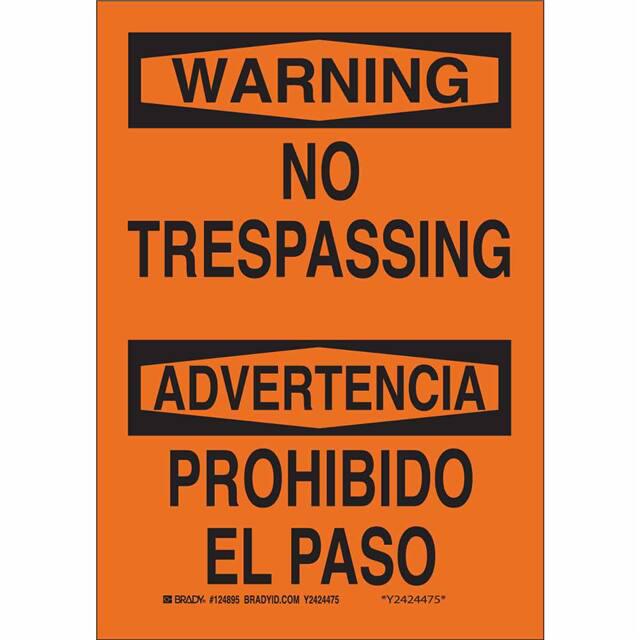 This is manufactured by Brady Corporation. The manufacturer part number is 124893. Label with a size of 10.00" l x 7.00" w (254.0mm x 177.8mm). The product is rohs3 compliant. It is assigned with possible HTSUS value of 8310.00.0000. It is shipped in bulk. It has a classic black legend, orange background colour. The product brady®, is a highly preferred choice for users. The product is made from highly stable and reliable aluminum. In addition, it is reach unaffected. Its typical moisture sensitivity level is not applicable. A bespoke label is a warning/advertencia. no trespassing/prohibido el paso label. The product is suitable for use with warning. It has a long 4 weeks standard lead time. The product is designated with the ear99 code number