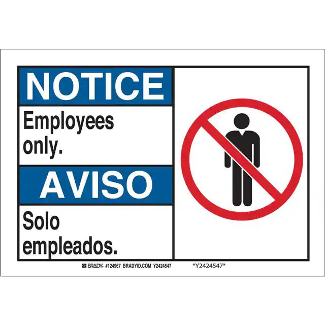 This is manufactured by Brady Corporation. The manufacturer part number is 124965. Label with a size of 10.00" l x 7.00" w (254.0mm x 177.8mm). The product is rohs3 compliant. It is assigned with possible HTSUS value of 8310.00.0000. It is shipped in bulk. It has a classic black, blue and red legend, white background colour. The product brady®, is a highly preferred choice for users. The product is made from highly stable and reliable aluminum. In addition, it is reach unaffected. Its typical moisture sensitivity level is not applicable. A bespoke label is a notice/aviso. employees only./solo empleados label. It has a long 4 weeks standard lead time. The product is designated with the ear99 code number