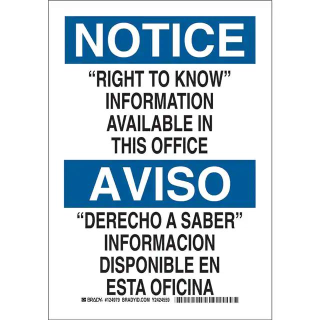 This is manufactured by Brady Corporation. The manufacturer part number is 124978. Label with a size of 10.00" l x 7.00" w (254.0mm x 177.8mm). The product is rohs3 compliant. It is assigned with possible HTSUS value of 3926.90.9985. It is shipped in bulk. It has a classic black and blue legend, white background colour. The product brady®, is a highly preferred choice for users. The product is made from highly stable and reliable polyester. In addition, it is reach unaffected. Its typical moisture sensitivity level is not applicable. A bespoke label is a right to know information available in this office. derecho a saber informacion disponible en esta oficina label. The product is suitable for use with notice. It has a long 4 weeks standard lead time. The product is designated with the ear99 code number