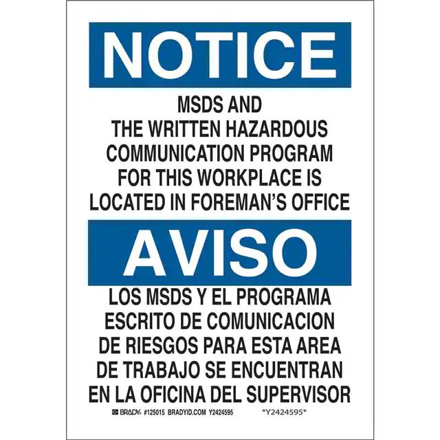 This is manufactured by Brady Corporation. The manufacturer part number is 125017. Label with a size of 14.00" l x 10.00" w (355.6mm x 254.0mm). The product is rohs3 compliant. It is assigned with possible HTSUS value of 3926.90.9985. It is shipped in bulk. It has a classic black and blue legend, white background colour. The product brady®, is a highly preferred choice for users. The product is made from highly stable and reliable polyester. In addition, it is reach unaffected. Its typical moisture sensitivity level is not applicable. A bespoke label is a notice/aviso. msds and the written hazardous communication program for this workplace is located in foremans office / los msds… label. The product is suitable for use with notice. It has a long 4 weeks standard lead time. The product is designated with the ear99 code number