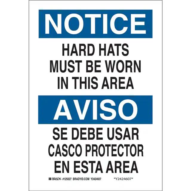 This is manufactured by Brady Corporation. The manufacturer part number is 125029. Label with a size of 14.00" l x 10.00" w (355.6mm x 254.0mm). The product is rohs3 compliant. It is assigned with possible HTSUS value of 3926.90.9985. It is shipped in bulk. It has a classic black and blue legend, white background colour. The product brady®, is a highly preferred choice for users. The product is made from highly stable and reliable polyester. In addition, it is reach unaffected. Its typical moisture sensitivity level is not applicable. A bespoke label is a notice/aviso. hard hats must be worn in this area/se debe usar casco protector en esta area label. It has a long 4 weeks standard lead time. The product is designated with the ear99 code number