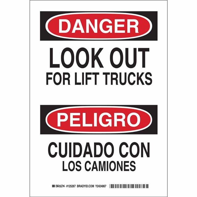This is manufactured by Brady Corporation. The manufacturer part number is 125270. Label with a size of 14.00" l x 10.00" w (355.6mm x 254.0mm). The product is rohs3 compliant. It is assigned with possible HTSUS value of 3926.90.9985. It is shipped in bulk. It has a classic black and red legend, white background colour. The product brady®, is a highly preferred choice for users. The product is made from highly stable and reliable polyester. In addition, it is reach unaffected. Its typical moisture sensitivity level is not applicable. A bespoke label is a danger. look out for lift trucks/cuidado con los camiones label. The product is suitable for use with danger. It has a long 4 weeks standard lead time. The product is designated with the ear99 code number