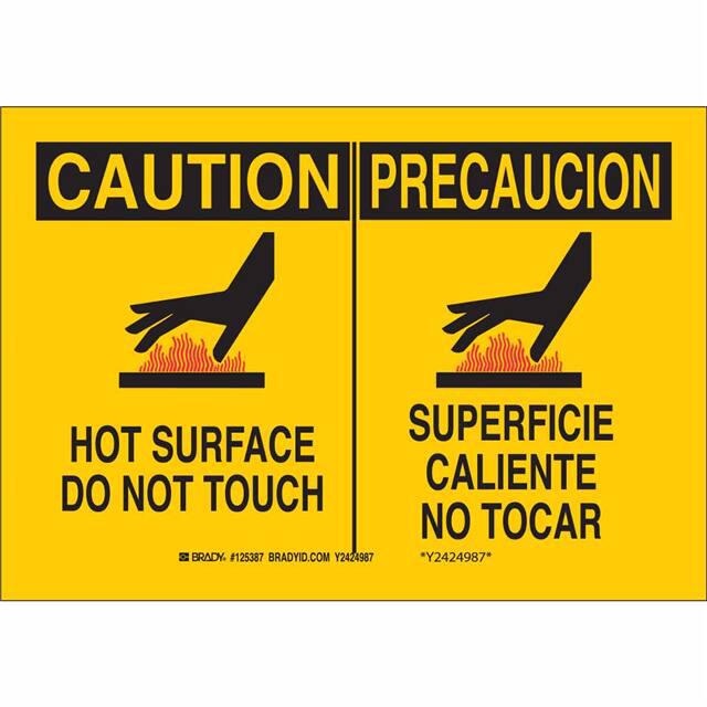 This is manufactured by Brady Corporation. The manufacturer part number is 125387. Label with a size of 10.00" l x 7.00" w (254.0mm x 177.8mm). The product is rohs3 compliant. It is assigned with possible HTSUS value of 3926.90.9985. It is shipped in bulk. It has a classic black and red legend, yellow background colour. The product brady®, is a highly preferred choice for users. The product is made from highly stable and reliable polyester. In addition, it is reach unaffected. Its typical moisture sensitivity level is not applicable. A bespoke label is a caution/precaucionhot surface do not touch/superficic caliente no tocar label. The product is suitable for use with warning. It has a long 4 weeks standard lead time. The product is designated with the ear99 code number