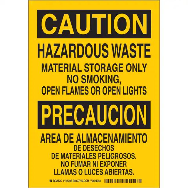 This is manufactured by Brady Corporation. The manufacturer part number is 125391. Label with a size of 10.00" l x 7.00" w (254.0mm x 177.8mm). The product is not applicable. It is assigned with possible HTSUS value of 8310.00.0000. It is shipped in bulk. It has a classic black legend, yellow background colour. The product brady®, is a highly preferred choice for users. The product is made from highly stable and reliable aluminum. In addition, it is reach affected. Its typical moisture sensitivity level is not applicable. A bespoke label is a caution/precaucion. hazardous waste material storage only no smoking, open flames or open lights/area de almacenamiento de d.. label. The product is suitable for use with fire. It has a long 4 weeks standard lead time. The product is designated with the ear99 code number