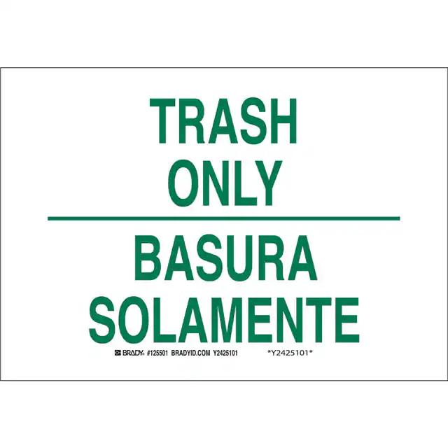 This is manufactured by Brady Corporation. The manufacturer part number is 125499. Label with a size of 10.00" l x 7.00" w (254.0mm x 177.8mm). The product is rohs3 compliant. It is assigned with possible HTSUS value of 8310.00.0000. It is shipped in bulk. It has a classic green legend, white background colour. The product brady®, is a highly preferred choice for users. The product is made from highly stable and reliable aluminum. In addition, it is reach unaffected. Its typical moisture sensitivity level is not applicable. A bespoke label is a trash only/basura solamente label. It has a long 4 weeks standard lead time. The product is designated with the ear99 code number