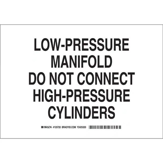 This is manufactured by Brady Corporation. The manufacturer part number is 125719. Label with a size of 10.00" l x 7.00" w (254.0mm x 177.8mm). The product is rohs3 compliant. It is assigned with possible HTSUS value of 3926.90.9985. It is shipped in bulk. It has a classic black legend, white background colour. The product brady®, is a highly preferred choice for users. The product is made from highly stable and reliable polyester. In addition, it is reach unaffected. Its typical moisture sensitivity level is not applicable. A bespoke label is a low-pressure manifold do not connect high-pressure cylinders label. The product is suitable for use with warning. It has a long 4 weeks standard lead time. The product is designated with the ear99 code number