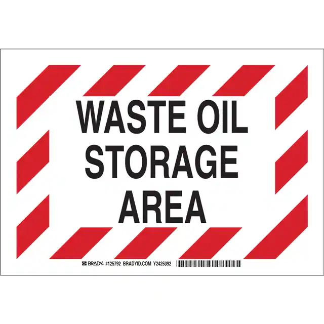 This is manufactured by Brady Corporation. The manufacturer part number is 125792. Label with a size of 10.00" l x 7.00" w (254.0mm x 177.8mm). The product is rohs3 compliant. It is assigned with possible HTSUS value of 3926.90.9985. It is shipped in bulk. It has a classic black and red legend, white background colour. The product brady®, is a highly preferred choice for users. The product is made from highly stable and reliable polyester. In addition, it is reach unaffected. Its typical moisture sensitivity level is not applicable. A bespoke label is a waste oil storage area label. The product is suitable for use with warning. It has a long 4 weeks standard lead time. The product is designated with the ear99 code number