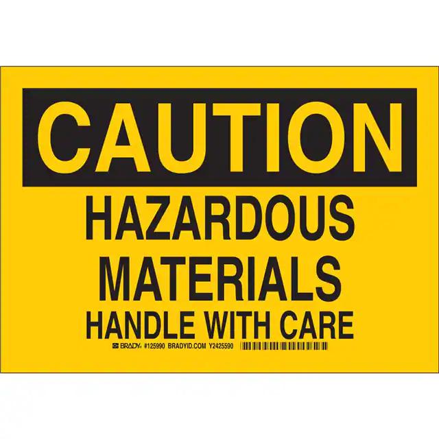 This is manufactured by Brady Corporation. The manufacturer part number is 125992. Label with a size of 14.00" l x 10.00" w (355.6mm x 254.0mm). The product is rohs3 compliant. It is assigned with possible HTSUS value of 3926.90.9985. It is shipped in bulk. It has a classic black legend, yellow background colour. The product brady®, is a highly preferred choice for users. The product is made from highly stable and reliable polyester. In addition, it is reach unaffected. Its typical moisture sensitivity level is not applicable. A bespoke label is a caution. hazardous materials handle with care label. The product is suitable for use with caution. It has a long 4 weeks standard lead time. The product is designated with the ear99 code number