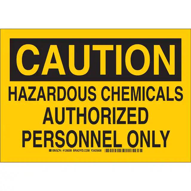 This is manufactured by Brady Corporation. The manufacturer part number is 126008. Label with a size of 10.00" l x 7.00" w (254.0mm x 177.8mm). The product is rohs3 compliant. It is assigned with possible HTSUS value of 3926.90.9985. It is shipped in bulk. It has a classic black legend, yellow background colour. The product brady®, is a highly preferred choice for users. The product is made from highly stable and reliable polyester. In addition, it is reach unaffected. Its typical moisture sensitivity level is not applicable. A bespoke label is a caution. hazardous chemicals authorized personnel only label. The product is suitable for use with caution. It has a long 4 weeks standard lead time. The product is designated with the ear99 code number