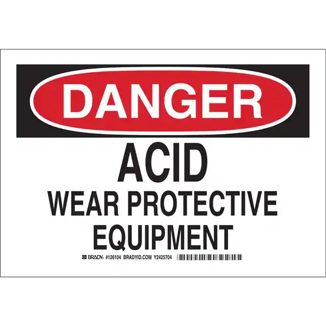 This is manufactured by Brady Corporation. The manufacturer part number is 126103. Label with a size of 10.00" l x 7.00" w (254.0mm x 177.8mm). The product is rohs3 compliant. It is assigned with possible HTSUS value of 3926.90.9985. It is shipped in bulk. It has a classic black and red legend, white background colour. The product brady®, is a highly preferred choice for users. The product is made from highly stable and reliable polyester. In addition, it is reach unaffected. Its typical moisture sensitivity level is not applicable. A bespoke label is a danger. acid wear protective equipment label. It has a long 4 weeks standard lead time. The product is designated with the ear99 code number