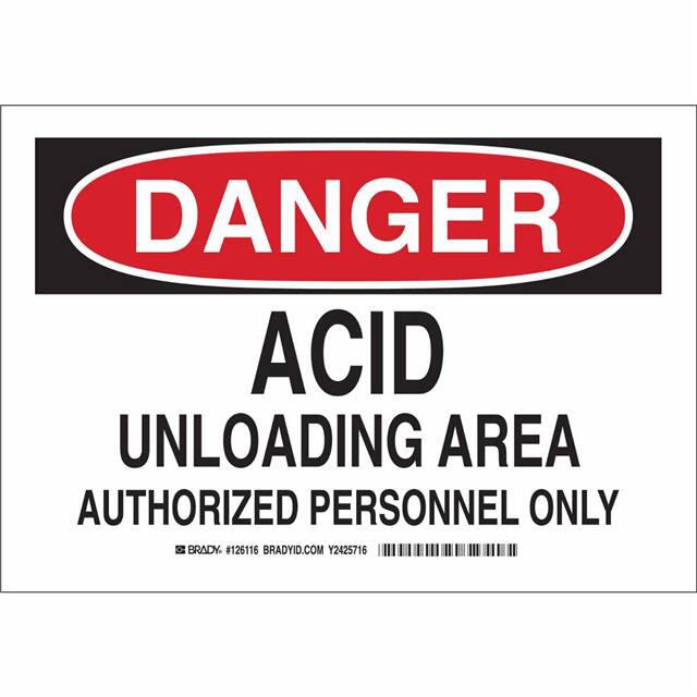 This is manufactured by Brady Corporation. The manufacturer part number is 126115. Label with a size of 10.00" l x 7.00" w (254.0mm x 177.8mm). The product is rohs3 compliant. It is assigned with possible HTSUS value of 3926.90.9985. It is shipped in bulk. It has a classic black and red legend, white background colour. The product brady®, is a highly preferred choice for users. The product is made from highly stable and reliable polyester. In addition, it is reach unaffected. Its typical moisture sensitivity level is not applicable. A bespoke label is a danger. acid unloading area authorized personnel only label. The product is suitable for use with danger. It has a long 4 weeks standard lead time. The product is designated with the ear99 code number