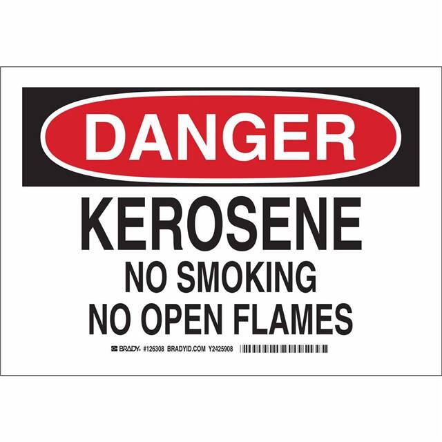 This is manufactured by Brady Corporation. The manufacturer part number is 126308. Label with a size of 10.00" l x 7.00" w (254.0mm x 177.8mm). The product is rohs3 compliant. It is assigned with possible HTSUS value of 3926.90.9985. It is shipped in bulk. It has a classic black and red legend, white background colour. The product brady®, is a highly preferred choice for users. The product is made from highly stable and reliable polyester. In addition, it is reach unaffected. Its typical moisture sensitivity level is not applicable. A bespoke label is a danger. kerosene no smoking no open flames label. The product is suitable for use with danger. It has a long 4 weeks standard lead time. The product is designated with the ear99 code number