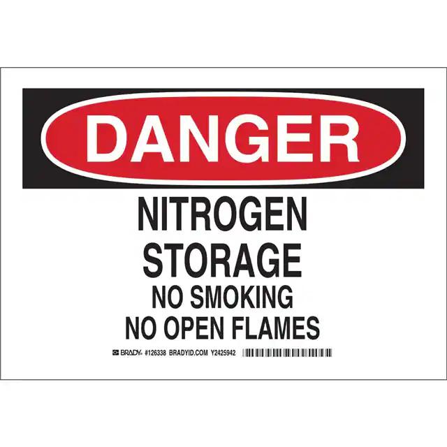 This is manufactured by Brady Corporation. The manufacturer part number is 126338. Label with a size of 10.00" l x 7.00" w (254.0mm x 177.8mm). The product is rohs3 compliant. It is assigned with possible HTSUS value of 3926.90.9985. It is shipped in bulk. It has a classic black and red legend, white background colour. The product brady®, is a highly preferred choice for users. The product is made from highly stable and reliable polyester. In addition, it is reach unaffected. Its typical moisture sensitivity level is not applicable. A bespoke label is a danger. nitrogen storage no smoking no open flames label. The product is suitable for use with danger. It has a long 4 weeks standard lead time. The product is designated with the ear99 code number