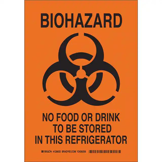 This is manufactured by Brady Corporation. The manufacturer part number is 126631. Label with a size of 10.00" l x 7.00" w (254.0mm x 177.8mm). The product is rohs3 compliant. It is assigned with possible HTSUS value of 3926.90.9985. It is shipped in bulk. It has a classic black legend, orange background colour. The product brady®, is a highly preferred choice for users. The product is made from highly stable and reliable polyester. In addition, it is reach unaffected. Its typical moisture sensitivity level is not applicable. A bespoke label is a biohazard no food or drink to be stored in this refrigerator label. It has a long 4 weeks standard lead time. The product is designated with the ear99 code number