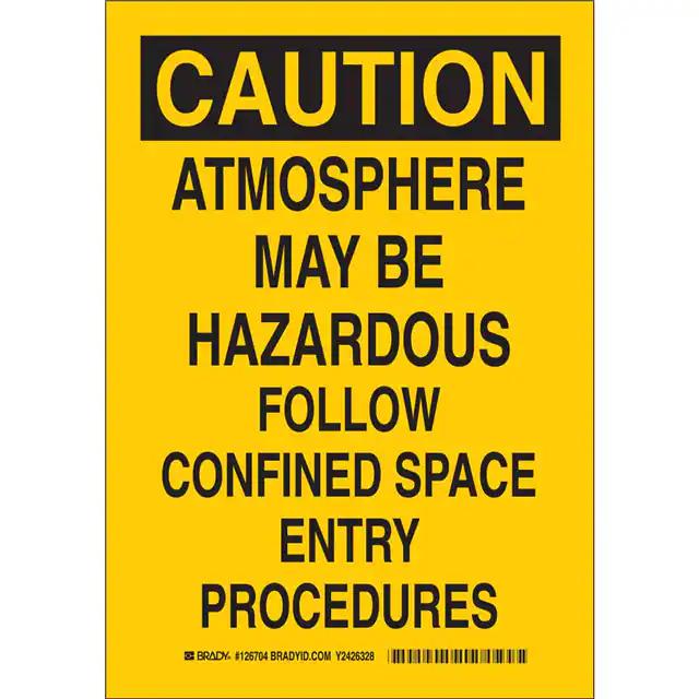 This is manufactured by Brady Corporation. The manufacturer part number is 126706. Label with a size of 14.00" l x 10.00" w (355.6mm x 254.0mm). The product is rohs3 compliant. It is assigned with possible HTSUS value of 3926.90.9985. It is shipped in bulk. It has a classic black legend, yellow background colour. The product brady®, is a highly preferred choice for users. The product is made from highly stable and reliable polyester. In addition, it is reach unaffected. Its typical moisture sensitivity level is not applicable. A bespoke label is a caution. atmosphere may be hazardous follow confined space entry procedures label. It has a long 4 weeks standard lead time. The product is designated with the ear99 code number