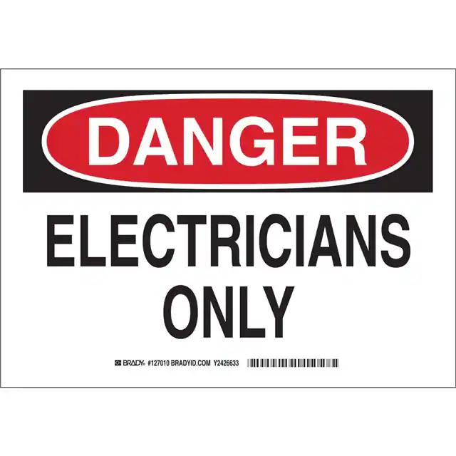 This is manufactured by Brady Corporation. The manufacturer part number is 127008. Label with a size of 10.00" l x 7.00" w (254.0mm x 177.8mm). The product is rohs3 compliant. It is assigned with possible HTSUS value of 8310.00.0000. It is shipped in bulk. It has a classic black and red legend, white background colour. The product brady®, is a highly preferred choice for users. The product is made from highly stable and reliable aluminum. In addition, it is reach unaffected. Its typical moisture sensitivity level is not applicable. A bespoke label is a danger. electricians only label. The product is suitable for use with warning. It has a long 4 weeks standard lead time. The product is designated with the ear99 code number