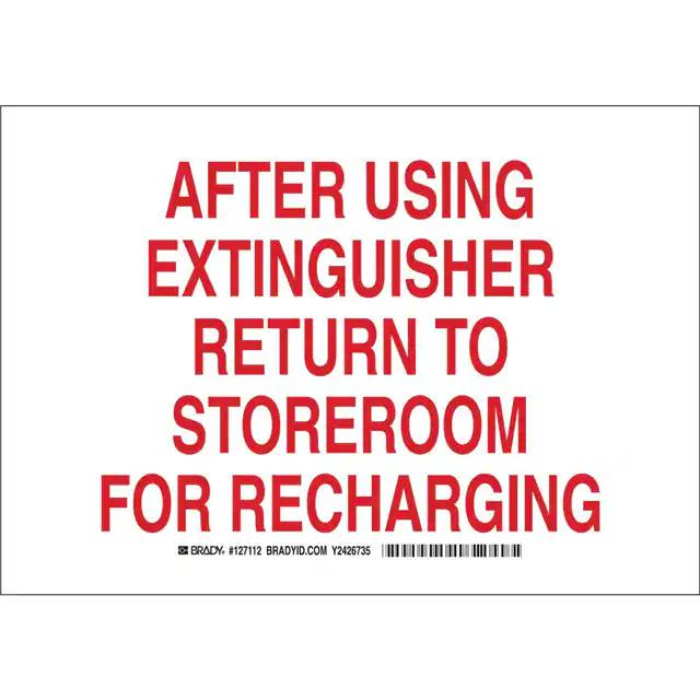 This is manufactured by Brady Corporation. The manufacturer part number is 127110. Label with a size of 10.00" l x 7.00" w (254.0mm x 177.8mm). The product is rohs3 compliant. It is assigned with possible HTSUS value of 8310.00.0000. It is shipped in bulk. It has a classic red legend, white background colour. The product brady®, is a highly preferred choice for users. The product is made from highly stable and reliable aluminum. In addition, it is reach unaffected. Its typical moisture sensitivity level is not applicable. A bespoke label is a after using extinguisher return to storeroom for recharging label. The product is suitable for use with notice. It has a long 4 weeks standard lead time. The product is designated with the ear99 code number