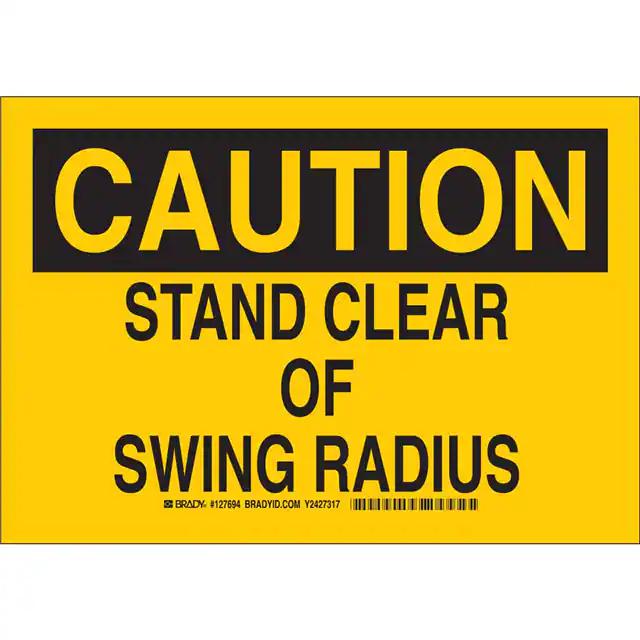 This is manufactured by Brady Corporation. The manufacturer part number is 127693. Label with a size of 10.00" l x 7.00" w (254.0mm x 177.8mm). The product is rohs3 compliant. It is assigned with possible HTSUS value of 3926.90.9985. It is shipped in bulk. It has a classic black legend, yellow background colour. The product brady®, is a highly preferred choice for users. The product is made from highly stable and reliable polyester. In addition, it is reach unaffected. Its typical moisture sensitivity level is not applicable. A bespoke label is a caution. stand clear of swing radius label. The product is suitable for use with warning. It has a long 4 weeks standard lead time. The product is designated with the ear99 code number