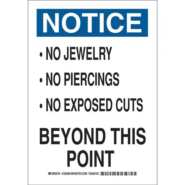 This is manufactured by Brady Corporation. The manufacturer part number is 128455. Label with a size of 10.00" l x 7.00" w (254.0mm x 177.8mm). The product is rohs3 compliant. It is assigned with possible HTSUS value of 3926.90.9985. It is shipped in bulk. It has a classic black and blue legend, white background colour. The product brady®, is a highly preferred choice for users. The product is made from highly stable and reliable polyester. In addition, it is reach unaffected. Its typical moisture sensitivity level is not applicable. A bespoke label is a notice. no jewelry no piercings no exposed cuts beyond this point label. It has a long 4 weeks standard lead time. The product is designated with the ear99 code number