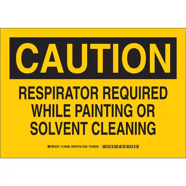 This is manufactured by Brady Corporation. The manufacturer part number is 128588. Label with a size of 10.00" l x 7.00" w (254.0mm x 177.8mm). The product is rohs3 compliant. It is assigned with possible HTSUS value of 3926.90.9985. It is shipped in bulk. It has a classic black legend, yellow background colour. The product brady®, is a highly preferred choice for users. The product is made from highly stable and reliable polyester. In addition, it is reach unaffected. Its typical moisture sensitivity level is not applicable. A bespoke label is a caution. respirator required while painting or solvent cleaning label. The product is suitable for use with warning. It has a long 4 weeks standard lead time. The product is designated with the ear99 code number