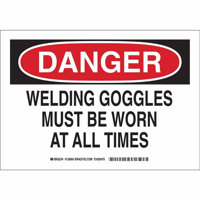 This is manufactured by Brady Corporation. The manufacturer part number is 128804. Label with a size of 10.00" l x 7.00" w (254.0mm x 177.8mm). The product is rohs3 compliant. It is assigned with possible HTSUS value of 3926.90.9985. It is shipped in bulk. It has a classic black and red legend, white background colour. The product brady®, is a highly preferred choice for users. The product is made from highly stable and reliable polyester. In addition, it is reach unaffected. Its typical moisture sensitivity level is not applicable. A bespoke label is a danger. welding goggles must be worn at all times label. The product is suitable for use with danger. It has a long 4 weeks standard lead time. The product is designated with the ear99 code number