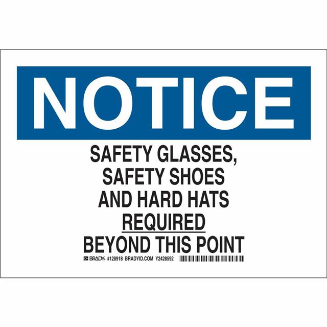 This is manufactured by Brady Corporation. The manufacturer part number is 128918. Label with a size of 10.00" l x 7.00" w (254.0mm x 177.8mm). The product is rohs3 compliant. It is assigned with possible HTSUS value of 3926.90.9985. It is shipped in bulk. It has a classic black and blue legend, white background colour. The product brady®, is a highly preferred choice for users. The product is made from highly stable and reliable polyester. In addition, it is reach unaffected. Its typical moisture sensitivity level is not applicable. A bespoke label is a notice. safety glasses, safety shoes, and hard hats required beyond this point label. The product is suitable for use with safety. It has a long 4 weeks standard lead time. The product is designated with the ear99 code number
