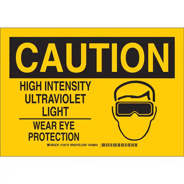 This is manufactured by Brady Corporation. The manufacturer part number is 129169. Label with a size of 10.00" l x 7.00" w (254.0mm x 177.8mm). The product is rohs3 compliant. It is assigned with possible HTSUS value of 3926.90.9985. It is shipped in bulk. It has a classic black legend, yellow background colour. The product brady®, is a highly preferred choice for users. The product is made from highly stable and reliable polyester. In addition, it is reach unaffected. Its typical moisture sensitivity level is not applicable. A bespoke label is a caution. high intensity ultraviolet light wear eye protection label. The product is suitable for use with warning. It has a long 4 weeks standard lead time. The product is designated with the ear99 code number