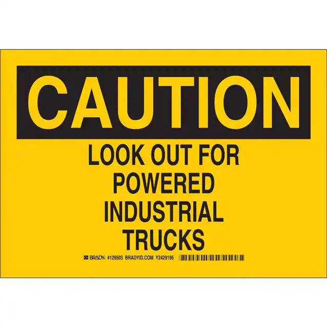 This is manufactured by Brady Corporation. The manufacturer part number is 129503. Label with a size of 10.00" l x 7.00" w (254.0mm x 177.8mm). The product is rohs3 compliant. It is assigned with possible HTSUS value of 3926.90.9985. It is shipped in bulk. It has a classic black legend, yellow background colour. The product brady®, is a highly preferred choice for users. The product is made from highly stable and reliable polyester. In addition, it is reach unaffected. Its typical moisture sensitivity level is not applicable. A bespoke label is a caution. look out for powered industrial trucks label. The product is suitable for use with caution. It has a long 4 weeks standard lead time. The product is designated with the ear99 code number