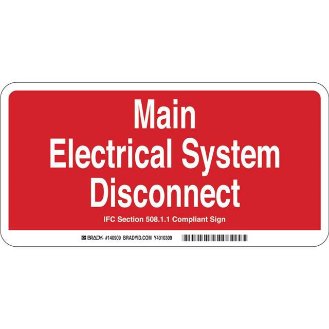 This is manufactured by Brady Corporation. The manufacturer part number is 140909. Label with a size of 10.00" l x 5.00" w (254.0mm x 127.0mm). The product is rohs3 compliant. It is assigned with possible HTSUS value of 3926.90.9985. It is shipped in bulk. It has a classic white legend, red background colour. The product brady®, is a highly preferred choice for users. The product is made from highly stable and reliable polyester. In addition, it is reach unaffected. Its typical moisture sensitivity level is not applicable. A bespoke label is a main electrical system disconnect ifc section 508.1.1 compliant sign label. The product is suitable for use with warning. It has a long 4 weeks standard lead time. The product is designated with the ear99 code number