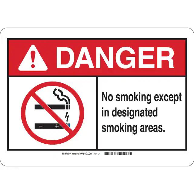 This is manufactured by Brady Corporation. The manufacturer part number is 143467. Label with a size of 10.00" l x 7.00" w (254.0mm x 177.8mm). The product is rohs3 compliant. It is assigned with possible HTSUS value of 8310.00.0000. It is shipped in bulk. It has a classic black and red legend, white background colour. The product brady®, is a highly preferred choice for users. The product is made from highly stable and reliable aluminum. In addition, it is reach unaffected. Its typical moisture sensitivity level is not applicable. A bespoke label is a danger. no smoking except in designated smoking areas label. It has a long 4 weeks standard lead time. The product is designated with the ear99 code number