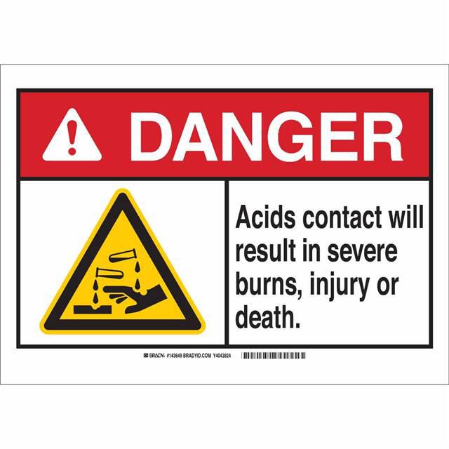 This is manufactured by Brady Corporation. The manufacturer part number is 143650. Label with a size of 10.00" l x 7.00" w (254.0mm x 177.8mm). The product is rohs3 compliant. It is assigned with possible HTSUS value of 3926.90.9985. It is shipped in bulk. It has a classic black, red and yellow legend, white background colour. The product brady®, is a highly preferred choice for users. The product is made from highly stable and reliable polyester. In addition, it is reach unaffected. Its typical moisture sensitivity level is not applicable. A bespoke label is a danger. acid. contact will result in serious burns, injury or death label. It has a long 4 weeks standard lead time. The product is designated with the ear99 code number