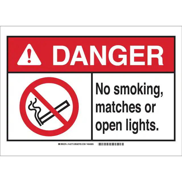 This is manufactured by Brady Corporation. The manufacturer part number is 143779. Label with a size of 10.00" l x 7.00" w (254.0mm x 177.8mm). The product is rohs3 compliant. It is assigned with possible HTSUS value of 8310.00.0000. It is shipped in bulk. It has a classic black and red legend, white background colour. The product brady®, is a highly preferred choice for users. The product is made from highly stable and reliable aluminum. In addition, it is reach unaffected. Its typical moisture sensitivity level is not applicable. A bespoke label is a danger. no smoking, matches or open lights label. The product is suitable for use with warning. It has a long 4 weeks standard lead time. The product is designated with the ear99 code number