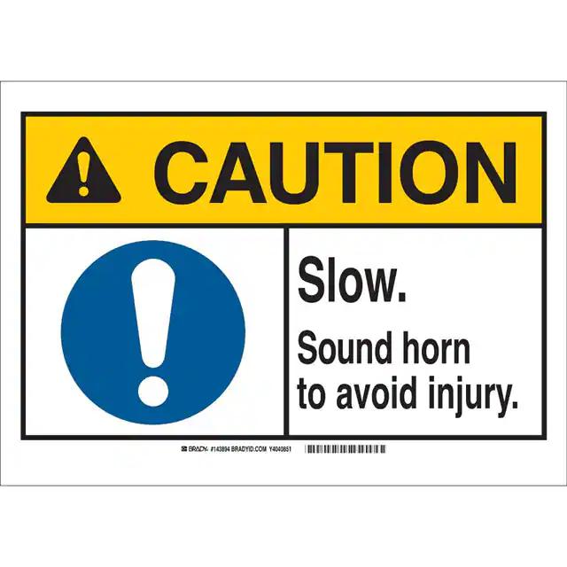 This is manufactured by Brady Corporation. The manufacturer part number is 143896. Label with a size of 10.00" l x 7.00" w (254.0mm x 177.8mm). The product is rohs3 compliant. It is assigned with possible HTSUS value of 3926.90.9985. It is shipped in bulk. It has a classic black, blue and yellow legend, white background colour. The product brady®, is a highly preferred choice for users. The product is made from highly stable and reliable polyester. In addition, it is reach unaffected. Its typical moisture sensitivity level is not applicable. A bespoke label is a caution. slow. sound horn to avoid injury label. The product is suitable for use with caution. It has a long 4 weeks standard lead time. The product is designated with the ear99 code number