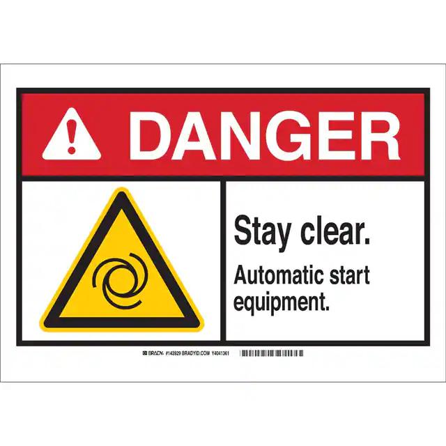 This is manufactured by Brady Corporation. The manufacturer part number is 143926. Label with a size of 10.00" l x 7.00" w (254.0mm x 177.8mm). The product is rohs3 compliant. It is assigned with possible HTSUS value of 3926.90.9985. It is shipped in bulk. It has a classic black, red and yellow legend, white background colour. The product brady®, is a highly preferred choice for users. The product is made from highly stable and reliable polyester. In addition, it is reach unaffected. Its typical moisture sensitivity level is not applicable. A bespoke label is a danger. stay clear automatic start equipment label. The product is suitable for use with warning. It has a long 4 weeks standard lead time. The product is designated with the ear99 code number