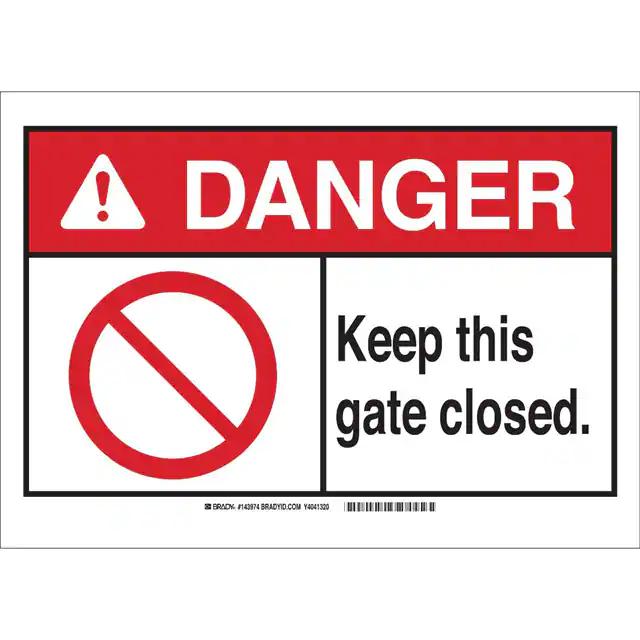This is manufactured by Brady Corporation. The manufacturer part number is 143973. Label with a size of 10.00" l x 7.00" w (254.0mm x 177.8mm). The product is rohs3 compliant. It is assigned with possible HTSUS value of 3926.90.9985. It is shipped in bulk. It has a classic black and red legend, white background colour. The product brady®, is a highly preferred choice for users. The product is made from highly stable and reliable polyester. In addition, it is reach unaffected. Its typical moisture sensitivity level is not applicable. A bespoke label is a danger. keep this gate closed label. It has a long 4 weeks standard lead time. The product is designated with the ear99 code number