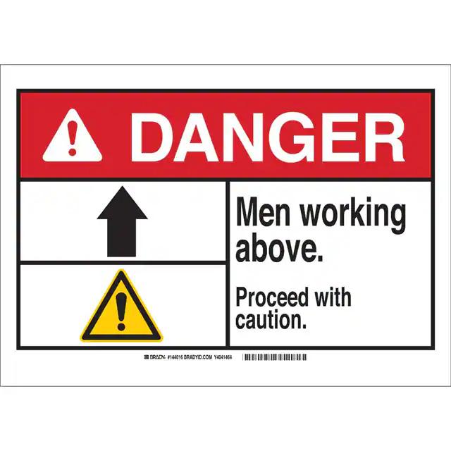 This is manufactured by Brady Corporation. The manufacturer part number is 144014. Label with a size of 10.00" l x 7.00" w (254.0mm x 177.8mm). The product is rohs3 compliant. It is assigned with possible HTSUS value of 8310.00.0000. It is shipped in bulk. It has a classic black and red legend, white background colour. The product brady®, is a highly preferred choice for users. The product is made from highly stable and reliable aluminum. In addition, it is reach unaffected. Its typical moisture sensitivity level is not applicable. A bespoke label is a danger. men working above proceed with caution label. The product is suitable for use with caution. It has a long 4 weeks standard lead time. The product is designated with the ear99 code number